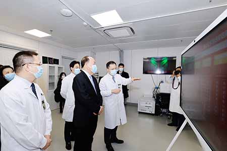 會面前,賀一誠在名譽院長趙玉沛院士,黨委書記、副院長吳沛新及副院長吳文銘等陪同下參觀了協和醫院轉化醫學綜合樓的設施,包括將會投入使用的臨床試驗病房,以及細胞生物學平台和生物樣本處理平台等,其後再到院史館參觀。期間行政長官與院方領導深入交流,瞭解醫院設施,尤其關心病房的設計和設備。