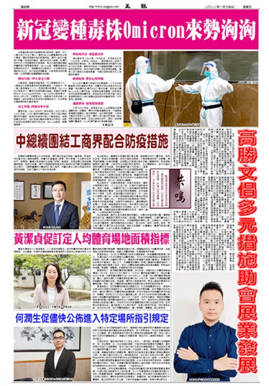 因應新冠變種病毒正在全球肆虐,澳門鄰近地區出現新一輪疫情,特區政府收緊多項入境措施應對,呼籲市民盡量減少群聚、節日聚餐,以及將在政府部門、娛樂場、醫療及飲食場所全面推行掃碼入場措施,多措並舉以降低病毒傳播風險,築起防疫牆。澳門中華總商會理事長馬志毅認同政府實行相關措施是必要的,中總將繼續努力團結和引領工商界,呼籲各業全力配合特區政府各項防疫措施,共同守護來之不易的防疫成果。