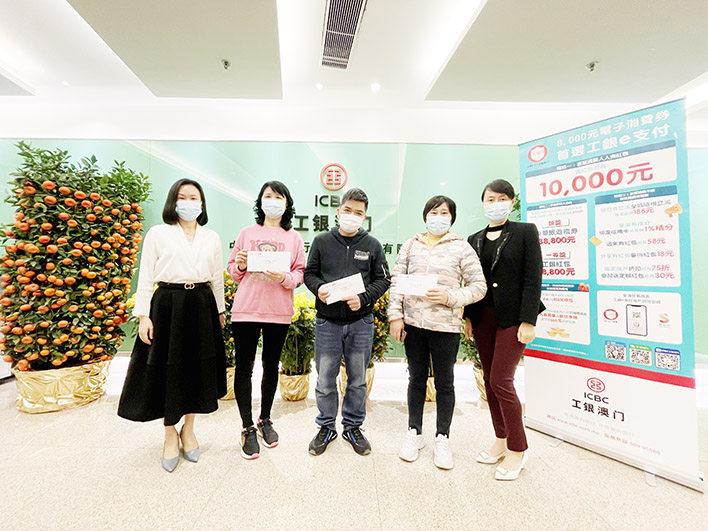【特訊】工銀澳門為參與“2021年電子消費優惠計劃”的“工銀e支付”客戶舉行年終大抽獎活動,於2022年1月21日在澳門博彩監察協調局專員的見證下,工銀澳門順利完成抽獎,送出頭獎豪華旅遊禮券澳門幣38,800元、一等獎“工銀e支付”紅包澳門幣18,800元、二等獎“工銀e支付”紅包澳門幣8,800元以及三等獎“工銀e支付”紅包澳門幣3,800元等二千多份獎品。1月28日,工銀澳門銀行卡業務部兼私人銀行部總經理閆潔女士及銀行卡業務部副主管余春寬女士向大獎得獎者頒獎,其餘得獎者名單已於工銀澳門網站公佈,並以短訊通知各得獎者領獎。