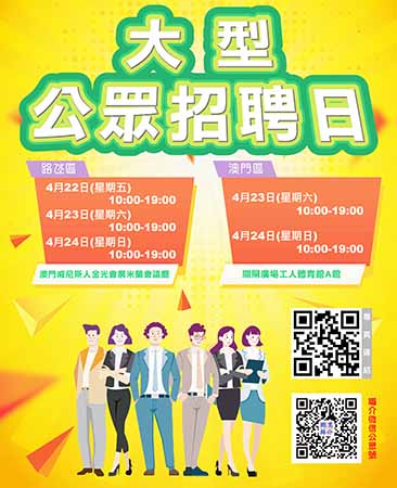 招聘日詳情可瀏覽大型公眾招聘日專頁https://www.dsal.gov.mo/zh_tw/standard/grandrecruit.html,如欲查詢,請於辦公時間內致電28722108 / 28700277。