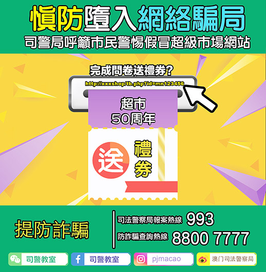 【特訊】司法警察局接獲市民通報,指其收到短訊受邀參與某超級市場50周年慶典的網上問卷調查,登入短訊所載網址並完成問卷可獲取禮券,疑為詐騙短訊。經調查,上述網址並非該公司的官方網站,且該公司從未舉辦此活動,故極有可能是網絡騙局。