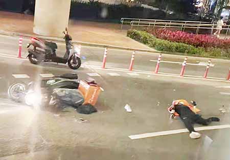 【特訊】路氹連貫公路圓形地近環型行人天橋底,發生奪命交通事故,一部旅遊巴和一部送外賣的電單車相撞,一名電單車男駕駛者腦部重創,左腳懷疑骨折,送院搶救後證實死亡。