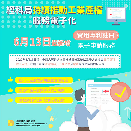 【特訊】為持續推動電子政務的發展,提供更便民便商的優質公共服務,經濟及科技發展局將自2022年6月13日起新增「實用專利註冊電子申請服務」,申請人可透過本局網站服務系統以電子方式提交實用專利註冊申請,在網上完成填寫資料、上載文件及繳費等提交申請的全流程。