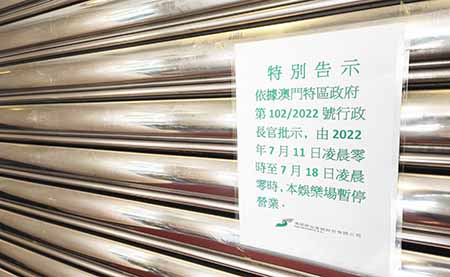 本澳昨日(十一日)起相對靜止管理,工商業場所停運七天,包括娛樂場。葡京娛樂場昨日凌晨零時拉起鐵閘,並張貼暫停營業的告示。鄰近的新葡京仍屬紅碼封控區,門外有防疫人員駐守,並架起圍欄和帳篷,兩名身穿新葡京制服的員工站於娛樂場入口處。