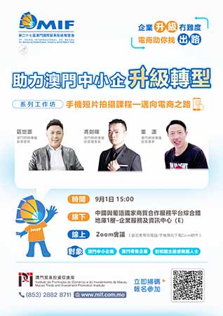 第27屆MIF於8月18日及9月1日,以線上線下融合形式舉辦兩場“助力澳門中小企升級轉型”系列工作坊,以“直播電商”為主題,邀請行業專家代表分享行業發展趨勢、基礎操作技巧等最新資訊,務求讓澳門中小企業在展前做好準備,更好利用展會的線上展廳、現場直播等安排,擴大產品推廣及銷售渠道,以及提升企業的技術含量。