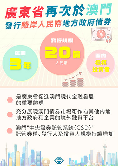 廣東省是次發行的債券面向機構投資者,發行規模為20億人民幣,期限為3年,發行利率定價為2.65%,投資者可藉此參與粵港澳大灣區的經濟建設。本次地方政府債券的發行深受市場歡迎,最終獲得2.5倍超額認購,發行取得圓滿成功,表明是次發行的債券較好地切合市場需求,同時也充分展現澳門債券市場可作為其他內地地方政府和企業的境外融資平台,建立了良好的示範作用。