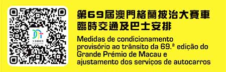 【特訊】交通事務局表示,配合第69屆澳門格蘭披治大賽車舉行,11月16日(周三)至20日(周日)賽道及周邊路段實施多項臨時交通管制措施。11月17日(周四)至20日(周日),50條巴士路線改道,H2路線停運,12T及31T免費穿梭巴士路線分別往返外港碼頭至亞馬喇前地及綜藝館。具體臨時交通和巴士調整安排,可掃描二維碼瀏覽交通事務局相關網頁。