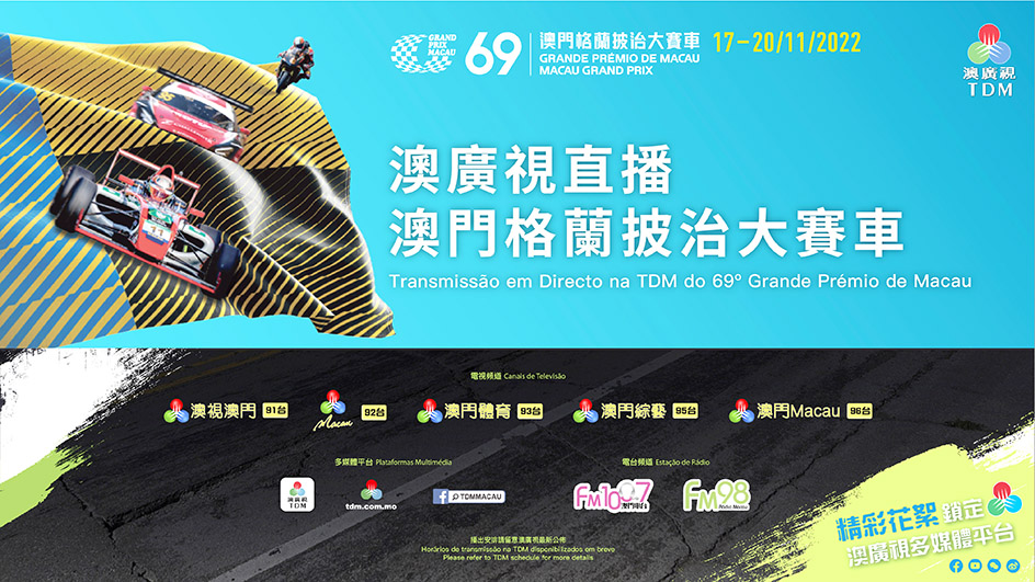 澳廣視將透過電視頻道《澳視澳門 91 台》、《澳視葡文 92 台》、《澳門體育 93 台》、《澳門 綜藝 95 台》、《澳門 - Macau 96 台》衛星電視頻道、網站及 TDM App 直播賽事,並由專業賽車評述員分析現場實況。澳門電台中文頻道 FM100.7 和葡文頻道 FM98(同步直播於澳廣視網站、 App 及數字電視 97 頻道),將為全澳巿民報導大賽車實況,聽眾亦請留意澳門電台的特別交通消息,以便掌握出行時間。 賽車期間,澳廣視社交平台亦將送上現場花絮及互動環節,為觀眾提供更優質多元的 「大賽車」 體驗,敬請密切留意。