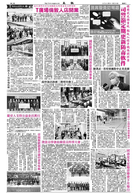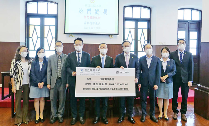 澳門國際銀行長期以來一直積極支持同善堂各項慈善事業,目前在本地十四家分行設立了同善堂捐款箱,並開立了電子銀行、手機銀行等線上捐款渠道,支持同善堂接收熱心市民的捐款。爲慶賀同善堂130周年,該行在年度例行捐贈基礎上再向同善堂特別捐贈二十萬元澳門幣,共同發揚澳門社會樂善好施的傳統美德。