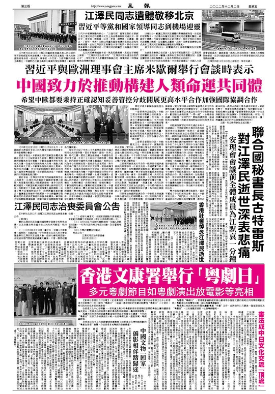 【香港中通社12月1日電】(香港中通社記者 李明珠)中國前國家主席江澤民2022年11月30日在上海逝世,香港社會各界各階層人士以各種方式表達沉痛哀悼。12月1日香港中聯辦等機構降半旗致哀,社會各界人士前往搭設的靈堂弔唁獻花。