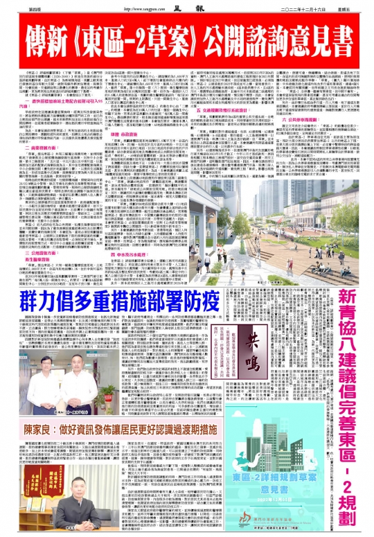 隨著國家優化疫情防控二十條及新十條原則,澳門疫情防控將進入過渡期,街坊總會理事長陳家良認同有關做法。又指出過渡期措施與過去相差較多,加上於未來或會經常調整,期望政府加強宣傳和解釋,讓居民更好地知悉防疫最新安排,以配合特區政府工作。他又期望居民做好充分準備,街坊總會將繼續與特區政府緊密合作,結合各種社會服務範疇,讓居民更好地度過有關時期。