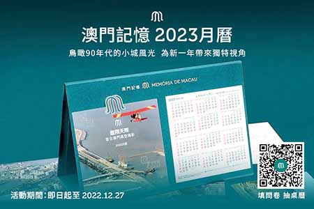至於澳門昔日航拍2023年月曆,圖片選輯上世紀90年代從小型飛機上拍下的澳門航拍照片,搭配磁貼底座,為新一年帶來獨一無二的視角及風景。巿民只需於即日起至本年12月27日在線上填寫對“澳門記憶”文史網的意見,即有機會參加抽獎,獲取兼具美感及實用的座枱曆,名額150份,歡迎大眾踴躍參與。
