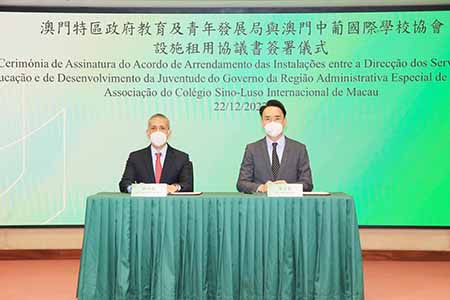 根據第100/2022號社會文化司司長批示授予之權力,2022年12月22日,澳門中葡國際學校協會設施租用協議書的簽署儀式在教育及青年發展局舉行,由教青局局長龔志明代表特區政府與澳門中葡國際學校協會代表歐安利簽署相關協議。