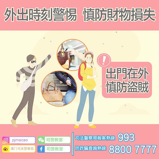 防盜小提示:前往人多擠迫的地方時(如商場、旅遊區或娛樂場所等),注意盡量將手機、錢包或手袋等貴重財物放於身前;外出活動時請盡量與陌生人保持距離,時刻提高警覺;外出購物或用膳期間,切記將個人財物放在當眼地方,並將手袋的拉鏈拉好,勿讓賊人有機可乘;購物時請盡量使用電子支付功能,避免使用大量現金;若懷疑遇到犯罪或發現有財物被竊時,應立即致電司警局報案熱線993 求助或舉報。