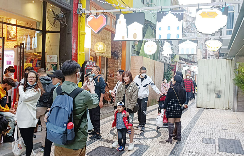【特訊】「二零二二幻彩耀濠江」的燈飾佈置保留至昨日(五日)元宵節後結束;設有燈光裝置的關前正街昨日晚上人流不多,有市民到場拍照留念。