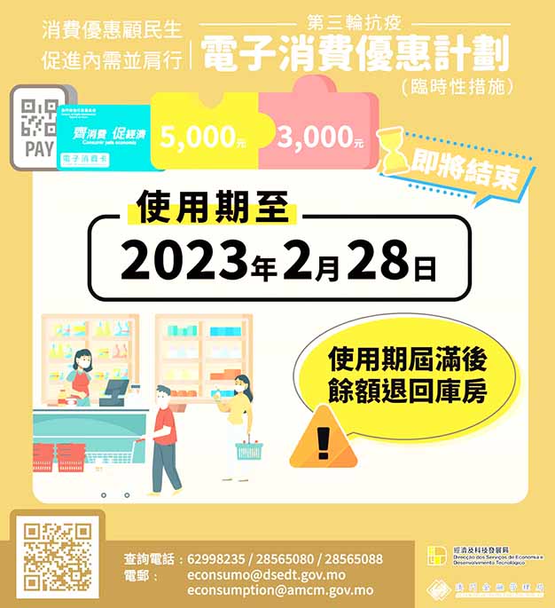 如居民對“第三輪抗疫電子消費優惠計劃”或“生活補貼計劃”有疑問,可瀏覽相關專題網頁(https://www.dsedt.gov.mo/econsumo或https://www.dsedt.gov.mo/subsidy),亦歡迎在辦公時間,按下列途徑查詢: