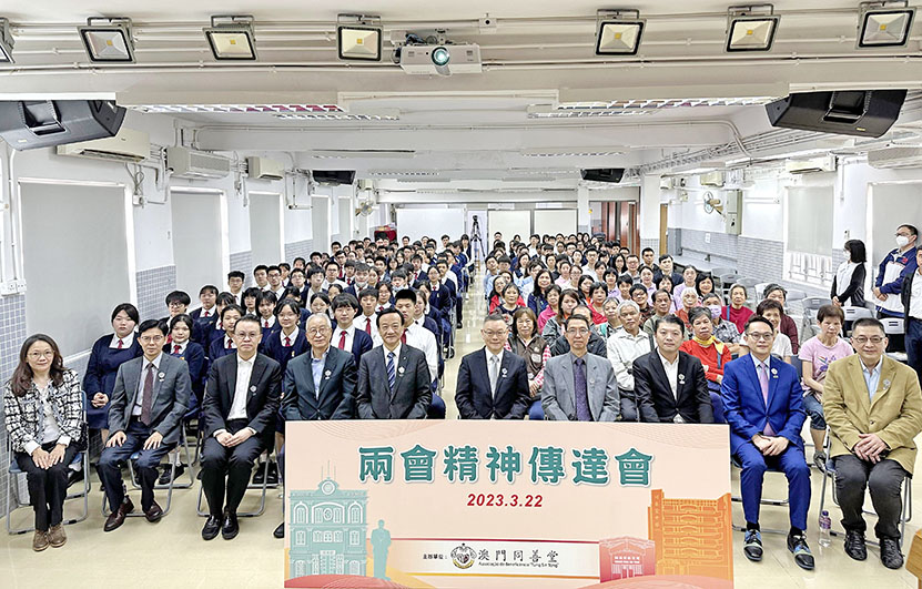 【特訊】為讓值理同仁、全體師生、員工及服務使用者深入了解本年兩會的情況,同善堂於3月22日舉辦 「兩會精神傳達會」,特邀澳區全國人大代表、同善堂值理會值理何敬麟及澳區全國政協委員、同善堂值理會值理兼同善堂中學校監莫志偉任主講嘉賓,與會者包括同善堂值理會主席崔世平、副主席劉藝良、馬有友、值理陸永根、李俊鳴、石崇榮、黃焯華、莊麗晶等,聯同現場及直播約450名師生、同善堂長者活動中心會員、各單位員工同參與。