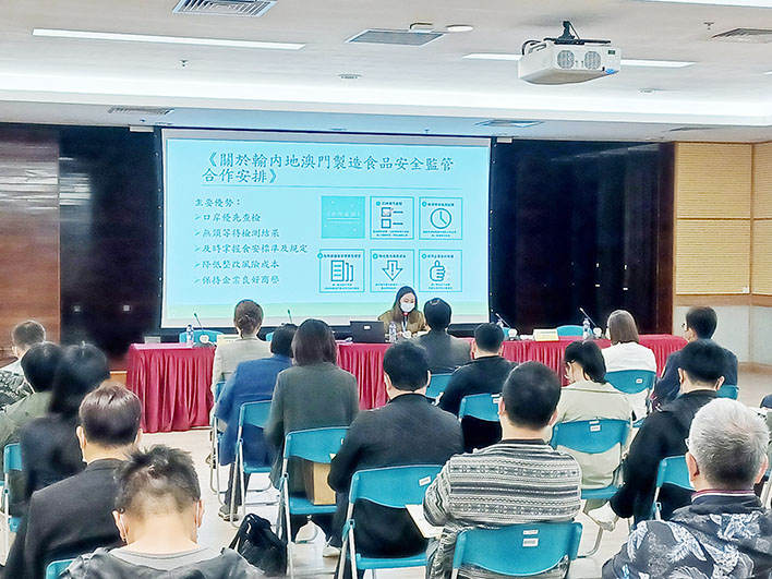 【特訊】為協助澳門製造食品符合內地通關便利要求,市政署日前舉辦《關於申請澳門製造食品輸內地事宜》說明會,向本澳食品業界講解在《關於輸內地澳門製造食品安全監管合作安排》框架下,澳門製造食品輸入內地的申請流程、准入條件及製品等要求。說明會亦邀請業界代表作經驗分享和技術交流,協助業界拓展內地市場,進一步保障食品安全及質量。