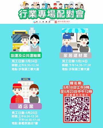 5月24日上午舉辦旅運及公共運輸業配對會,提供95個職位空缺,涉及車長、站長、車務員、站務員、客服員及清潔員。下午舉辦家居建材業配對會,提供206個職位空缺,涉及招商專員、營銷策劃專員、店務員、各類裝修工人及配送安裝工人等。上述配對會在澳門工會聯合總會(沙梨頭海邊街2-6號工聯大廈)舉行。