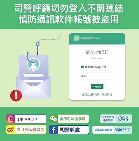鑒於近年不法份子透過上述手段盜取市民通訊軟件帳號後,再向該帳號內的”好友”進行詐騙,部分案件更造成財產損失。為此,司警局呼籲市民,切勿點擊來歷不明的短訊連結,應循官方渠道確認短訊內容的真實性,以及小心核對連結及網頁上顯示的相關資料是否正確,切勿輕易提供個人或驗證碼等資料。