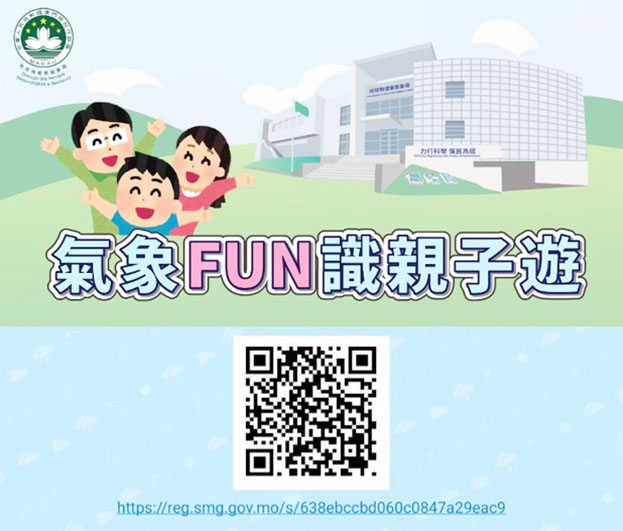 最新一期的「氣象FUN識親子遊」將於8月26日(星期六)舉行,活動費用全免,歡迎本澳4至8歲兒童及其家長參與,報名以家庭為單位,每組家庭可登記2至5人,歡迎家長於8月1日至5日登入活動登記系統進行報名,名額約50人,若報名人數超過招募數量,將採用電腦抽籤方式決定,活動詳情可瀏覽氣象局網頁 https://www.smg.gov.mo/zh/news-detail/473。