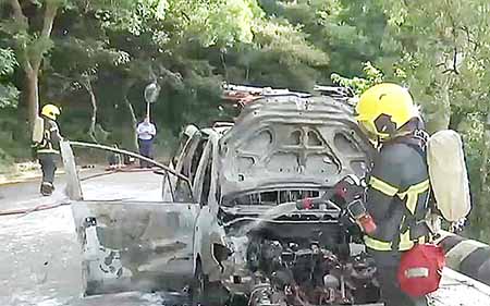 【特訊】路環高頂馬路昨日下午四時三十分,有汽車起火焚毀,沒有人受傷,消防經調查後,初步懷疑事故原因為機件故障引致。