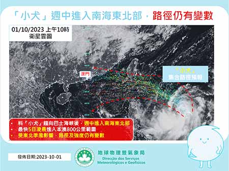 氣象局表示,按最新的集合預測路徑顯示,「小犬」未來兩三日將緩慢向西北方向移動,趨向巴士海峽。隨後,副熱帶高壓(引導氣流)會有所加強,「小犬」移速會加快,並較大機會向偏西方向移動進入南海,最快於週四(五日)凌晨進入本澳八百公里範圍,且不排除較接近廣東沿岸。