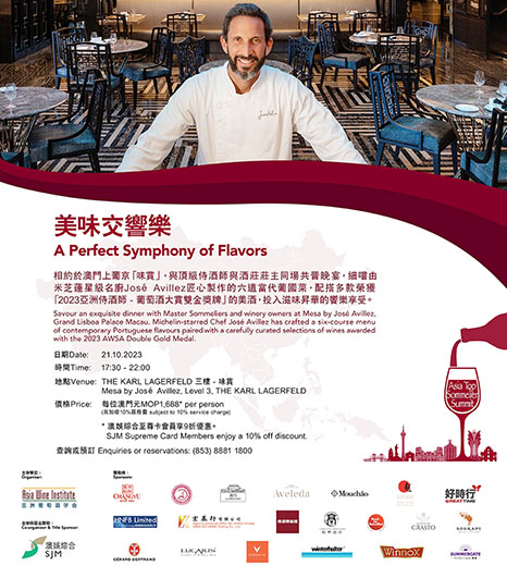 「美味交響樂」星級晚宴;榮獲「2023亞洲侍酒師 - 葡萄酒大賞雙金獎牌」的11款葡萄酒及其酒莊莊主將於10月21日共聚上葡京綜合度假村的「味賞」餐廳,舉行「美味交響樂」星級晚宴。晚宴之前,賓客將與侍酒大師Pierre-Marie Pattieu MS一同品鑑此11款雙金獎葡萄酒,並由AWSA 評委主席武肖斌介紹獲獎標準。隨後,米芝蓮星級名廚José Avillez將為賓客呈獻六道葡國美饌,每道佳餚各配以一款雙金獎葡萄酒。