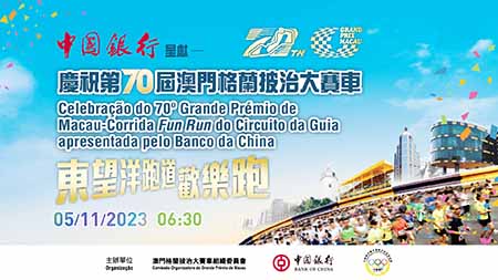 「中國銀行呈獻—慶祝第70屆澳門格蘭披治大賽車—東望洋跑道歡樂跑」將於11月5日(周日)上午6時30分在東望洋跑道開跑,全程約6.2公里,起點及終點均設於澳門格蘭披治賽車大樓。