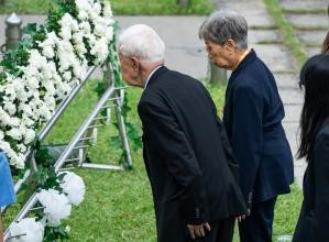 隨後,員警樂隊奏響哀樂。伴隨哀樂的奏鳴,身著黑色正裝的香港特區行政長官李家超敬獻花圈,向保衛香港而捐軀的人士致以崇高的敬意。隨後,中央人民政府駐港機構代表、香港特區政府官員、香港特區司法機構代表、香港特區立法會議員、多位外國駐港領事館代表、宗教界人士、原東江縱隊港九獨立大隊成員、退伍軍人團體、制服團隊和學生代表等也逐一上前敬獻花圈並鞠躬致意。