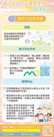 上述平台功能涵蓋更改工程所有業務,透過平台填寫的資料及上載的文件與線下基本相同,所有上載文件須使用PDF格式。為便利業界,已在線下開展中的更改工程項目,可於線上辦理後續流程業務,例如在紙本工程計劃獲核准後,可選擇於平台提交發出工程准照申請。平台並設有暫存功能,於10天內保留已輸入的資料及文件供後續補充及完成提交。
