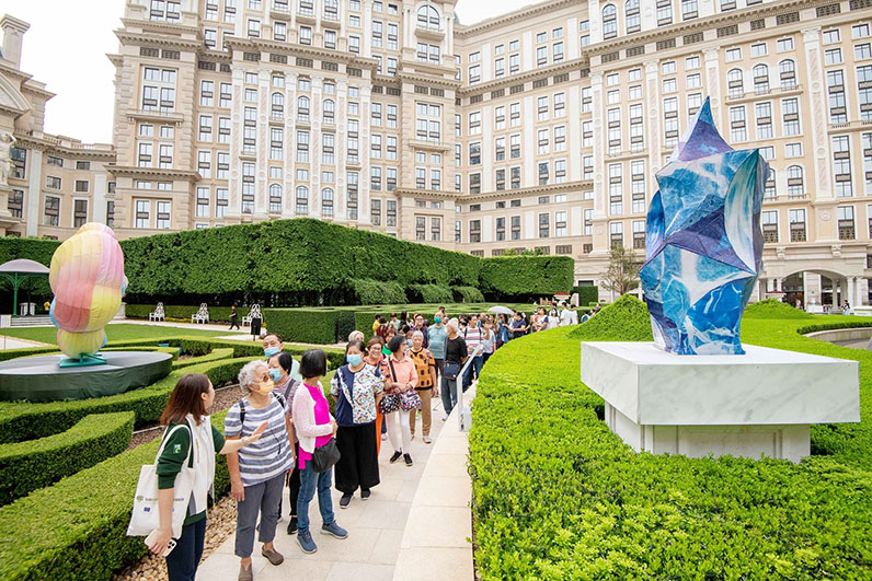 長者們於午後抵達上葡京,在澳娛綜合團隊成員的帶領下參觀「燈影幻彩慶團圓」燈藝展的大型花燈裝置,一系列別具巧思的燈藝傑作由亞洲及本地藝術家共同創作,展現時下潮流邂逅傳統藝術之魅力。大部分花燈裝置在「綠茵勝境」花園展出,長者一邊欣賞花燈,一邊享受景色怡人的歐式庭園美景。其後,一眾長者享用精緻下午茶餐點,澳娛綜合團隊成員特別為長者們帶來歌唱表演,並組織互動小遊戲,與長者共度歡樂時光,其樂融融。