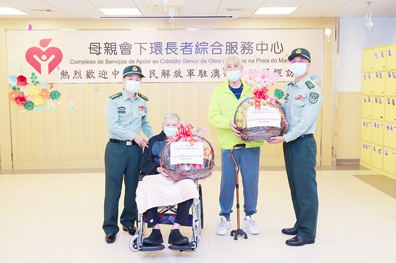 駐澳部隊官兵代表和社會工作局人員首先參觀了母親會下環長者綜合服務中心院護服務樓層,於起居室與長者互動,亦慰問臥床安養的長者,向他們致以真摯的祝福,肯定他們為澳門建設發展做出的貢獻。