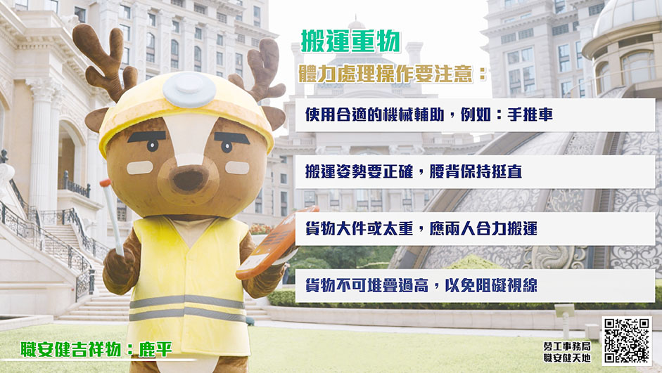 該八條宣傳影片涵蓋餐飲、房務和設施管理等多個部門的工作範疇。為更貼合實際工作情況,影片由勞工局人員指導相關職安健知識,並由澳娛綜合員工擔綱演出,於公司旗下物業拍攝。透過生動的情境演示、專業的職安健建議,以輕鬆有趣的方式深化員工對職安健的認識。影片於九月份在勞工局的職安健活動中啟播,並持續於澳娛綜合旗下物業的員工後勤區播放,充分彰顯勞、資、政三方對職安健文化的重視。