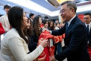 據瞭解,此次發放的“暖心包”是獨具中國風特色的大紅帆布包,寓意新的一年一帆風順,萬事如意。在“暖心包”裡,有總領館致領區同胞的新年賀卡、含安全提醒的領保宣傳卡片,還有福字、對聯、中國結等節慶用品以及花生、瓜子、糖果等傳統年貨,以讓大家在異國他鄉感受到鄉情和“年味”。 “我要特別感謝各位僑領和同學們的積極響應和大力支持。”黃屏充分肯定領區僑學界長期以來為支持祖國發展建設、和平統一大業以及中美關係發展等作出的積極貢獻,鼓勵大家堅定不移做中國式現代化的支持者和參與者,堅持不懈做中美友好的維護者和促進者,為兩國關係健康穩定發展不斷注入新的動力。