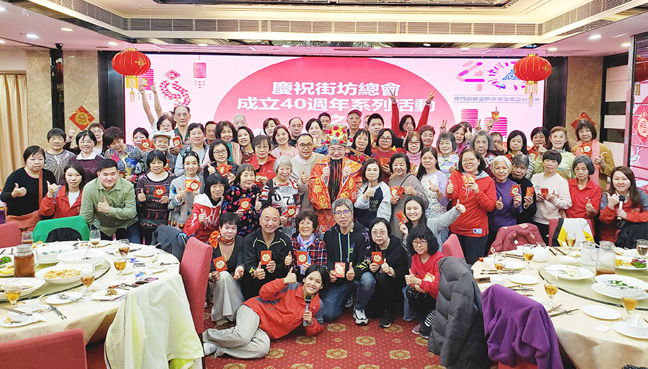 【特訊】澳門“平安通”呼援服務中心於二月二十四日假帝濠軒酒家舉辦「慶祝街坊總會成立40週年暨義工同賀新春團拜」活動,街坊總會社會服務辦公室協調主任梁詠恩及“平安通”呼援服務中心經理潘嘉倫出席,與六十四位義工同賀新春,并勉勵義工們過去的付出,感謝義工們的支持,同時亦鼓勵義工們繼續參與及支持義務工作,並與“平安通”一起努力構建一個社會關愛長者的平台。是次活動內容豐富,包括遊戲、表演、抽獎、派發新春利是和慶生等,旨在提升義工凝聚力,透過節日活動讓義工相聚及交流心得,該活動由社工局贊助。