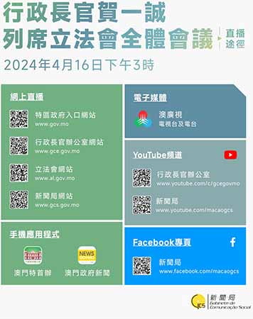 澳廣視屬下電視台及電台屆時將會現場直播。公眾亦可透過以下途徑觀看網上直播:網站:澳門特區政府入口網站(www.gov.mo);行政長官辦公室網站(www.gce.gov.mo);立法會網站(www.al.gov.mo)新聞局網站(www.gcs.gov.mo)。