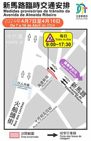 【特訊】為配合“內港南雨水泵站及下水道工程”將於新馬路近海邊新街一段進行地下施工,基於安全考慮,新馬路往火船頭街方向於4月7日(周日)至16日(周二)每日上午9時至下午5時30分,在警方協助下將實施有限度通車,佔用左側部份車道(詳見交通安排示意圖),並按實時情況調整交通燈配時。工程期間巴士服務不受影響。