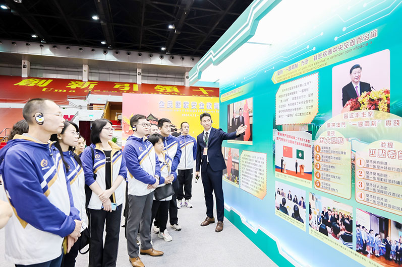 活動期間,在駐場導賞員的帶領下,銀娛團隊成員參觀展覽的 5 個專題部份,透過現場的圖片展版、文字敍述及影片展示等方式,深入學習國家提出總體國家安全觀理念 10 年以來,國家安全體系及能力現代化的高水平發展及所取得的一系列偉大成就;以及特區政府在維護國家安全、推動落實「愛國者治澳」、積極融入國家發展大局等方面的相關工作及成果。為讓更多團隊成員全面了解教育展內容,銀娛亦於員工後勤區張貼活動海報,並透過員工手機應用程式「銀娛觸角」及內部電郵向團隊成員傳達是次展覽的相關資訊,宣揚學習國家安全知識的重要性。
