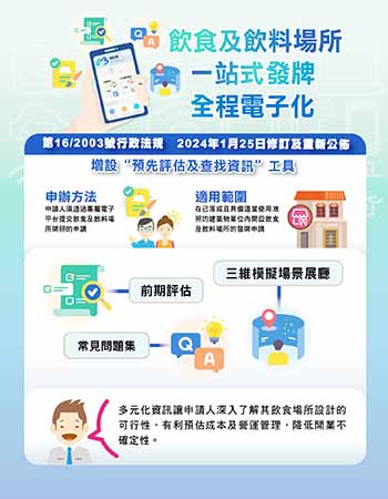 全電子化辦理牌照的做法較以往透過一站式辦理申請飲食牌照服務更為便捷,現時已可透過網上遞交電子圖則並完成審批,更可直接於電子平台預約消防及聯合驗收日期。申請人可更清晰審批流程及步驟,以便全程即時跟進,助業界取得牌照。