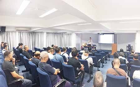 海事局與勞工局代表向碼頭業界和從業人員講解安全運送和儲存化學品的工作要點,包括認識化學品的危害、化學品安全管理制度、化學品標籤制度及物料安全資料表,並分享運送化學品常見意外成因,以及危險化學品洩漏的處理原則,就緊急應變措施與個人防護裝備方面給予安全操作指引和意見,並強調透過加強集體與個人保護措施,可有效避免發生工傷意外事故。