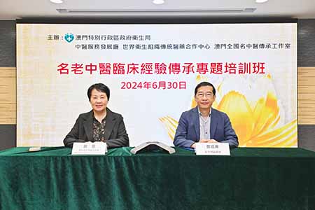 【特訊】衛生局中醫服務發展廳、世界衛生組織傳統醫藥合作中心(澳門)、澳門全國名中醫傳承工作室日前以線上形式共同舉辦“名老中醫臨床經驗傳承專題培訓班”,邀請全國名中醫劉景源教授、江蘇省名中醫郭宏敏教授和北京中醫藥大學東直門醫院劉寧主任,分別就“傷寒與温熱病初期的辨治之別”、“中醫養生與老年病臨床特徵及防治淺談”、“老年心腦疾患從瘀論治辨析”及“新醫學體系概論”進行專題講座,共吸引近500人次本澳中醫藥從業人員報名及參與。鄭成業副局長和世界衛生組織傳統醫藥合作中心莫蕙主任出席並主持活動。