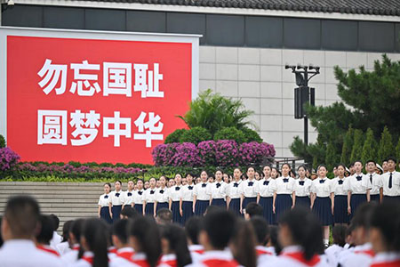 盧溝橋畔,中國人民抗日戰爭紀念館巍然矗立、莊嚴肅穆。上午9時,紀念儀式在雄壯的國歌聲中開始。首都學生代表飽含深情地朗誦了抗戰詩文,首都大學生合唱團演唱了歌曲《團結就是力量》《沒有共產黨就沒有新中國》,表達了年輕一代傳承英烈精神,積極投身中國式現代化建設,立志為全面推進強國建設、民族復興偉業貢獻力量的堅定信唸信心。