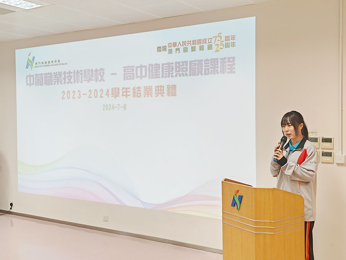 典禮結束後,畢業生分享了他們在過去一年的學習及實習經驗,並鼓勵高二和高三的同學為未來的學習做好準備。第六屆健康照顧課程的校友、現為澳門鏡湖護理學院學生也特地分享他修讀護理專業的學習適應及成長過程,為新一屆畢業生提供寶貴的經驗和建議。