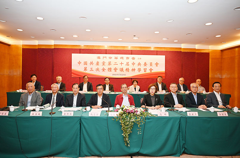 【特訊】澳門中華總商會於昨(二十三)晚在會址舉行了「中國共產黨第二十屆中央委員會第三次全體會議精神學習會」。會議由該會理事長馬志毅主持,邀請了澳門特區行政會委員楊道匡擔任主講嘉賓,向與會的會長、會董、理事、監事分享他對二十屆三中全會精神的解讀。中總永遠會長馬有禮,監事長高明,副理事長崔煜林、崔世平、林金城、余健楚、劉藝良、何佩芬、黃樹森、何富强、徐達明、蕭志偉、葉兆佳,副監事長黃如楷、劉永誠,會董蕭婉儀、杜琪新、關小冰、邱金海等近百人出席了學習會。