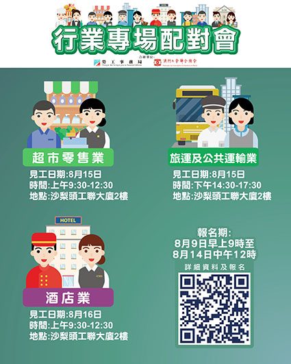8月15日上午舉辦超市零售業配對會,提供100個職位空缺,涉及店務員、收銀員、理貨員、肉類處理員、蔬果包裝員等。下午舉辦旅運及公共運輸業配對會,提供39個職位空缺,涉及車長、站長、安全督導員及夜間安全專員。