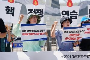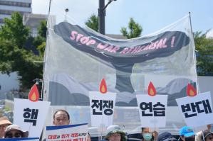 參加集會的韓國民眾手持“反對核戰爭演練”“拒絕軍事演習,構建溝通渠道”等標語,高呼“反對參加韓美軍演”“停止韓美軍演”等口號。