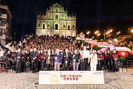 【特訊】由文化局主辦、澳門樂團有限公司承辦的“月滿三巴夜2024”中秋音樂會,於17日8時及9時在大三巴牌坊舉行,澳門中樂團在瑰麗的世遺景區呈獻多首經典樂曲,吸引市民遊客欣賞,歡度團圓佳節。音樂會由澳門中樂團音樂總監兼首席指揮張列執棒,以一曲《新彩雲追月》拉開序幕。是次演奏版本由《彩雲追月》改編而成,優美旋律與圓月之夜互相輝映,是中秋夜的點題之作。澳門中樂團隨後演奏多首經典樂曲,包括結合廣東民謠《月光光》及《龍貓》主題曲的《月光光下的龍貓》,透過活潑生動的演繹,喚起在場觀眾的共鳴;《一生所愛》《青花瓷》《紅玫瑰》等曲風各異的深情之作,均令觀眾沉醉其中。音樂會特別邀請古淖文首次聯袂澳門中樂團登場獻唱,演繹《城裡的月光》《祝君好》兩首流行經典歌曲,精彩演出為佳節倍添氣氛。