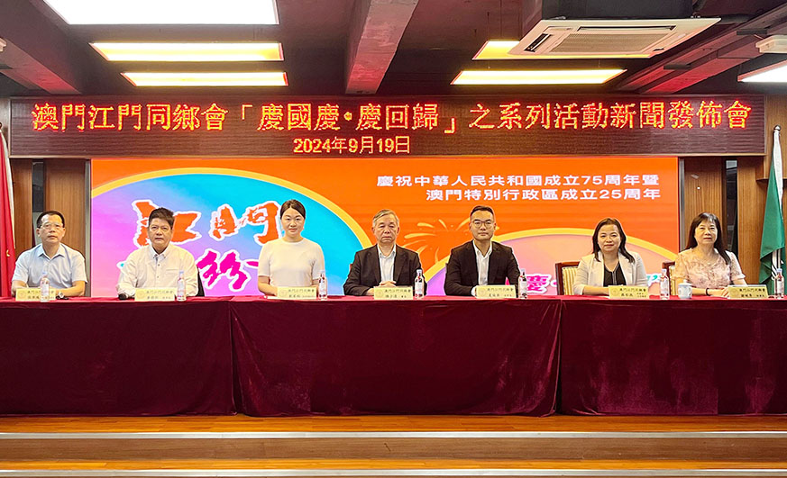「慶國慶•慶回歸」系列活動新聞發佈會昨午在江門同鄉會文體康樂中心舉行,會長陳少清、首席常務副會長劉家裕、理事長夏俊英、監事長黃德秋、常務副會長張偉鴻、副會長兼立法議員羅彩燕、秘書長謝婉秀出席介紹系列活動詳情。