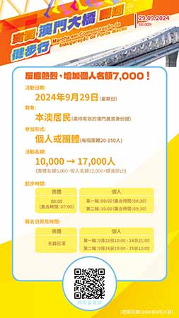 【特訊】為熱烈慶祝中華人民共和國成立75周年及澳門特別行政區成立25周年,體育局將於9月29日,在澳門大橋開通前舉辦“齊賀澳門大橋開通健步行”。活動自9月19日報名以來,得到廣大市民的熱情參與,報名情況踴躍。體育局經與各相關部門會商,綜合評估後,將活動的參加名額由10,000個增加至17,000個。現時團體報名已結束,第一輪個人報名於22日上午10時至9月24日晚上9時進行,名額5,000;新增的第二輪個人報名則於9月24日上午10時至9月25日中午12時進行,名額7,000,額滿即止。